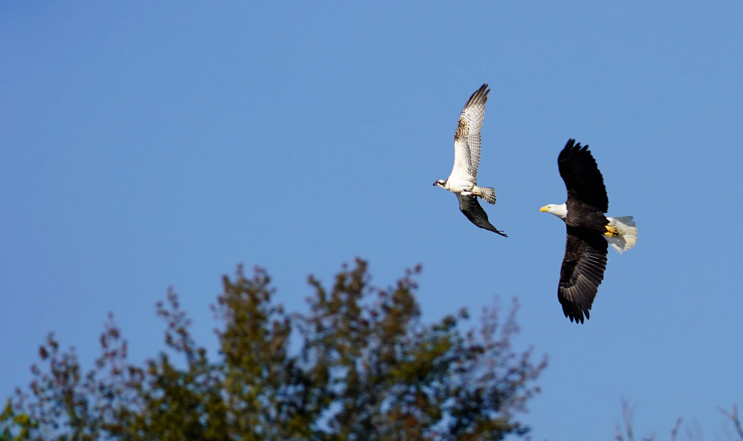 This adult Bald Eagle flew in and began chasing the Osprey, trying to steal his fish.