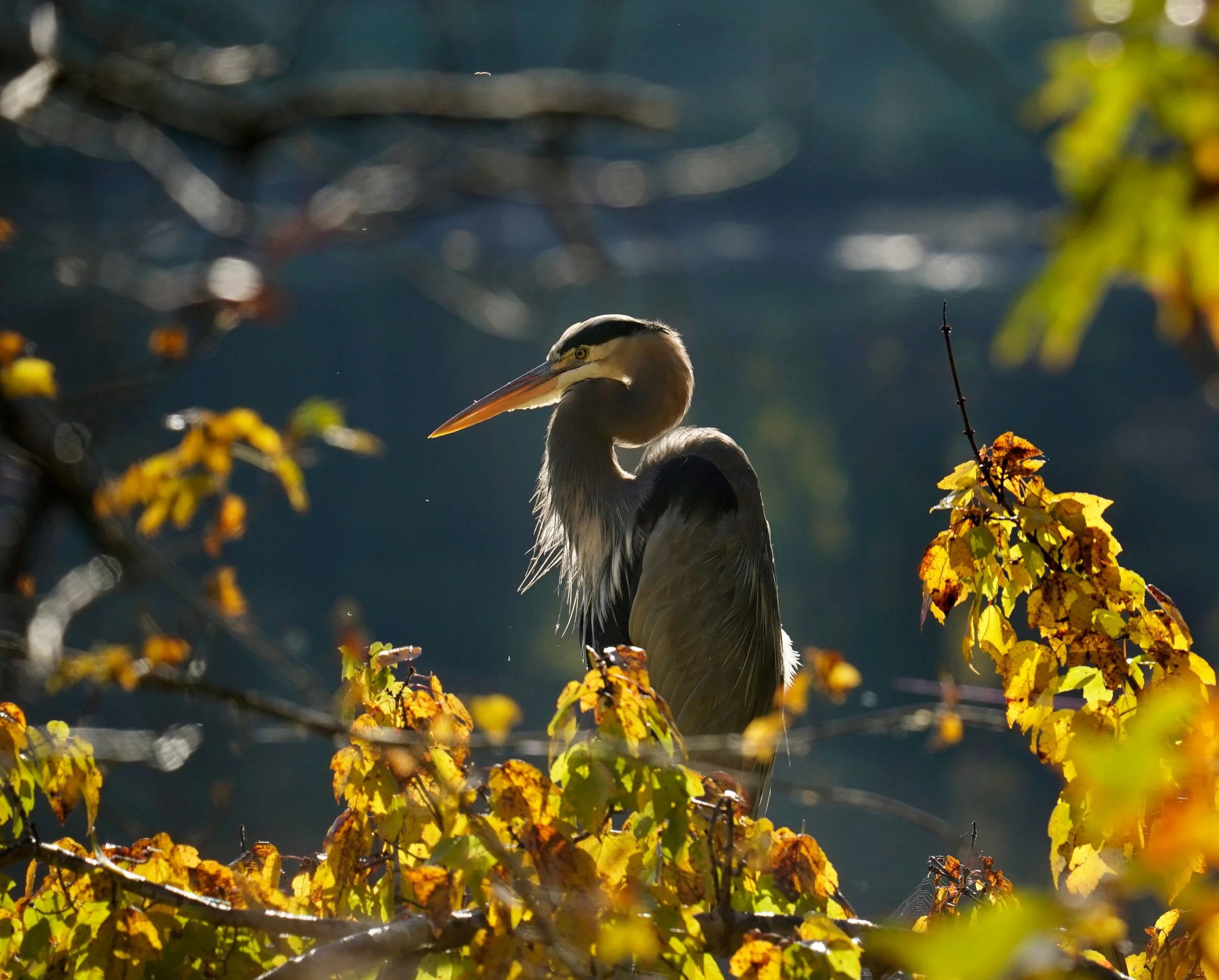 A Great Blue Heron resting in the trees of Bond Park, Cary, North Carolina with the sun shining through the autumn foliage